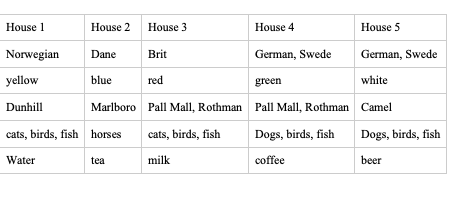 How did we arrive at this? You can work this all out by making a table. In the top row, list all the houses, 1-5 (where the numbers relate to position - ie: 1 is to the left of 2, 3 is to the right of 2, etc.). Then in each column, list the main attributes: